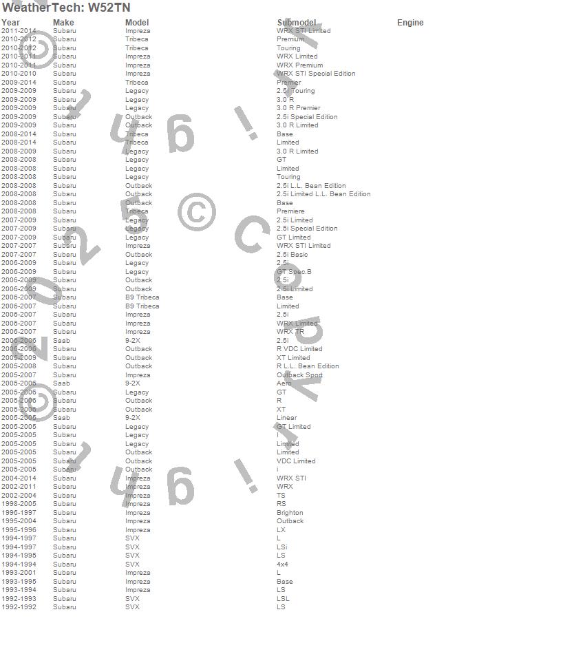 Below is an abbreviated list of applications for the All Weather Floor Mats.9-2X, B9 Tribeca, Impreza, Legacy, Outback, SVX, Tribeca, Saab, Subaru, 2014, 2013, 2012, 2011, 2010, 2009, 2008, 2007, 2006, 2005, 2004