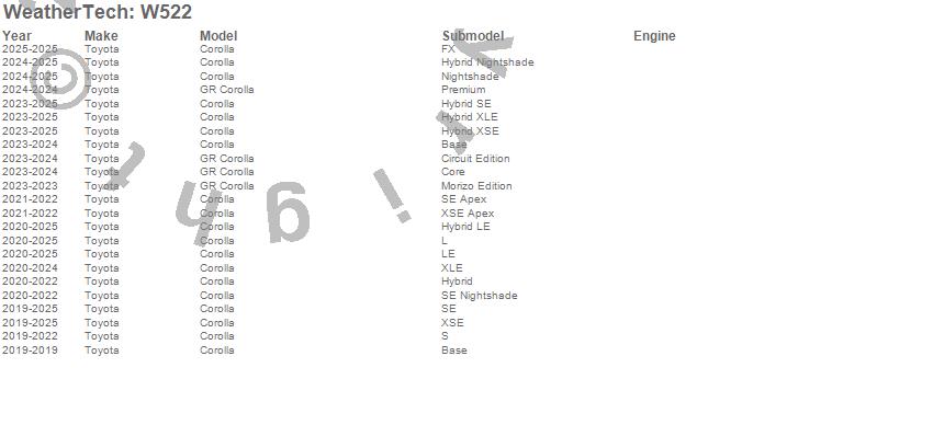 Below is an abbreviated list of applications for the All Weather Floor Mats.Corolla, GR Corolla, Toyota, 2025, 2024, 2023, 2022, 2021, 2020, 2019
