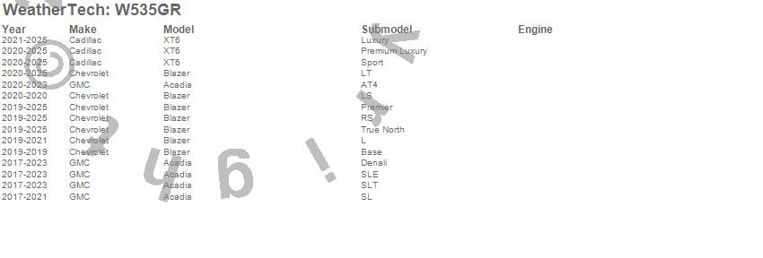 Below is an abbreviated list of applications for the All Weather Floor Mats.Acadia, Blazer, XT6, Cadillac, Chevrolet, GMC, 2026, 2025, 2024, 2023, 2022, 2021, 2020, 2019, 2018, 2017