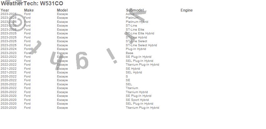 Below is an abbreviated list of applications for the All Weather Floor Mats.Escape, Ford, 2026, 2025, 2024, 2023, 2022, 2021, 2020