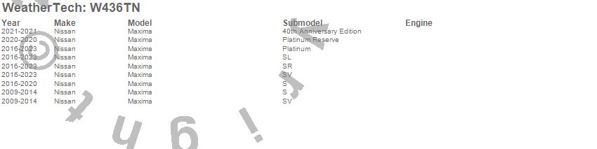 Below is an abbreviated list of applications for the All Weather Floor Mats.Maxima, Nissan, 2023, 2022, 2021, 2020, 2019, 2018, 2017, 2016, 2014, 2013, 2012, 2011, 2010, 2009