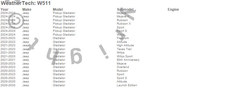 Below is an abbreviated list of applications for the All Weather Floor Mats.Gladiator, Pickup Gladiator, Jeep, 2026, 2025, 2024, 2023, 2022, 2021, 2020