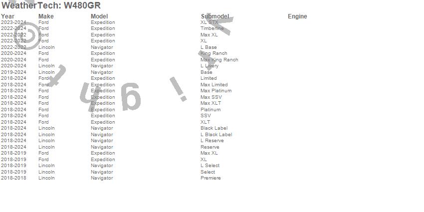Below is an abbreviated list of applications for the All Weather Floor Mats.Expedition, Navigator, Ford, Lincoln, 2024, 2023, 2022, 2021, 2020, 2019, 2018