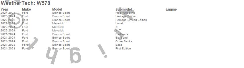 Below is an abbreviated list of applications for the All Weather Floor Mats.Bronco Sport, Maverick, Ford, 2025, 2024, 2023, 2022, 2021