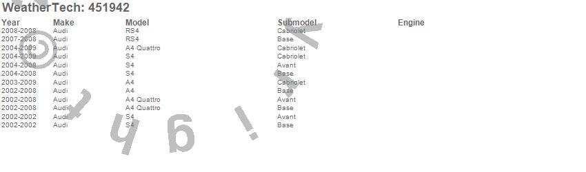 Below is an abbreviated list of applications for the FloorLiner DigitalFit.A4, A4 Quattro, RS4, S4, Audi, 2009, 2008, 2007, 2006, 2005, 2004, 2003, 2002