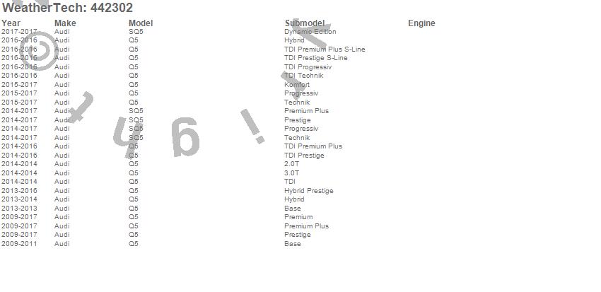Below is an abbreviated list of applications for the FloorLiner DigitalFit.Q5, SQ5, Audi, 2017, 2016, 2015, 2014, 2013, 2012, 2011, 2010, 2009