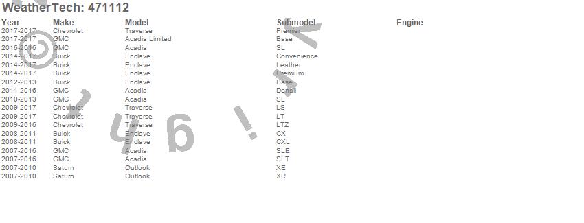 Below is an abbreviated list of applications for the FloorLiner DigitalFit.Acadia, Acadia Limited, Enclave, Outlook, Traverse, Buick, Chevrolet, GMC, Saturn, 2017, 2016, 2015, 2014, 2013, 2012, 2011, 2010, 2009, 2008, 2007
