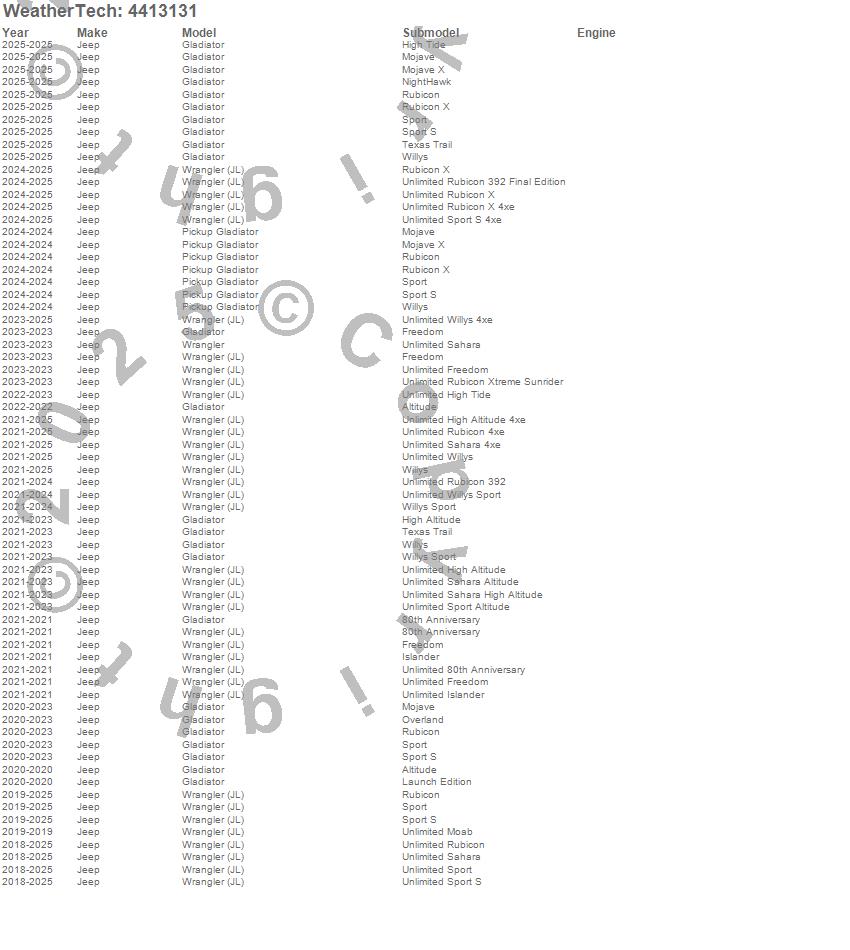 Below is an abbreviated list of applications for the FloorLiner DigitalFit.Gladiator, Pickup Gladiator, Wrangler, Wrangler (JL), Jeep, 2026, 2025, 2024, 2023, 2022, 2021, 2020, 2019, 2018