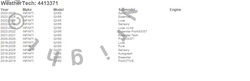 Below is an abbreviated list of applications for the FloorLiner DigitalFit.QX50, QX55, INFINITI, 2025, 2024, 2023, 2022, 2021, 2020, 2019