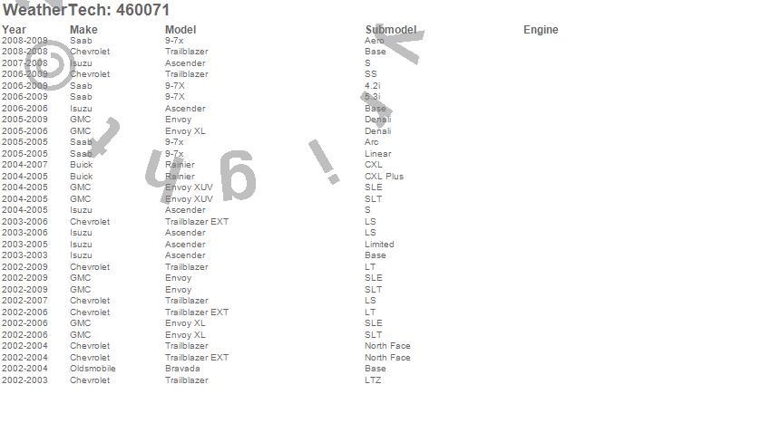 Below is an abbreviated list of applications for the FloorLiner DigitalFit.9-7X, Ascender, Bravada, Envoy, Envoy XL, Envoy XUV, Rainier, Trailblazer, Trailblazer EXT, Buick, Chevrolet, GMC, Isuzu, Oldsmobile, Saab, 2009, 2008, 2007, 2006, 2005