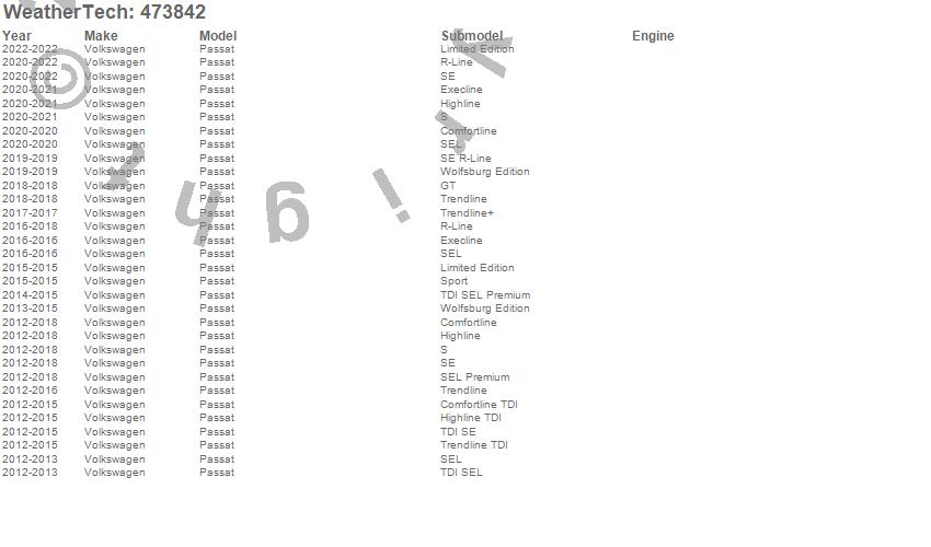 Below is an abbreviated list of applications for the FloorLiner DigitalFit.Passat, Volkswagen, 2022, 2021, 2020, 2019, 2018, 2017, 2016, 2015, 2014, 2013, 2012