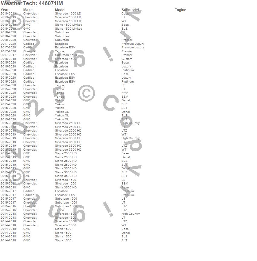 Below is an abbreviated list of applications for the FloorLiner HP.Escalade, Escalade ESV, Sierra 1500, Sierra 1500 Limited, Sierra 2500 HD, Sierra 3500 HD, Silverado 1500, Silverado 1500 LD, Silverado 2500 HD, Silverado 3500 HD, Suburban, Suburban 1500, Tahoe, Yukon, Yukon XL, Cadillac, Chevrolet, GMC, 2020, 2019