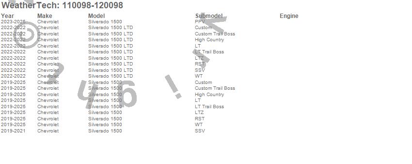 Below is an abbreviated list of applications for the MudFlap No-Drill DigitalFit MudFlap Kit.Silverado 1500, Silverado 1500 LTD, Chevrolet, 2026, 2025, 2024, 2023, 2022, 2021, 2020, 2019