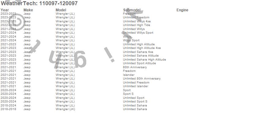 Below is an abbreviated list of applications for the MudFlap No-Drill DigitalFit MudFlap Kit.Wrangler, Wrangler (JL), Jeep, 2026, 2025, 2024, 2023, 2022, 2021, 2020, 2019, 2018