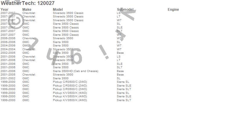 Below is an abbreviated list of applications for the MudFlap No-Drill DigitalFit.C3500 Pickup, K3500 Pickup, Sierra 3500, Sierra 3500 Classic, Sierra 3500HD, Silverado 3500, Silverado 3500 Classic, Chevrolet, GMC, 2007, 2006, 2005, 2004, 2003, 2002, 2001, 2000, 1999