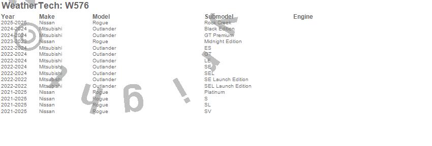Below is an abbreviated list of applications for the All Weather Floor Mats.Outlander, Rogue, Mitsubishi, Nissan, 2026, 2025, 2024, 2023, 2022, 2021