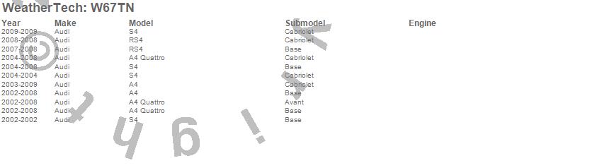 Below is an abbreviated list of applications for the All Weather Floor Mats.A4, A4 Quattro, RS4, S4, Audi, 2009, 2008, 2007, 2006, 2005, 2004, 2003, 2002