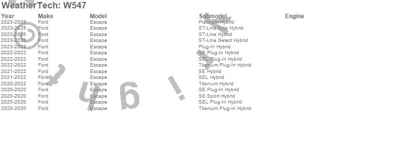 Below is an abbreviated list of applications for the All Weather Floor Mats.Escape, Ford, 2026, 2025, 2024, 2023, 2022, 2021, 2020