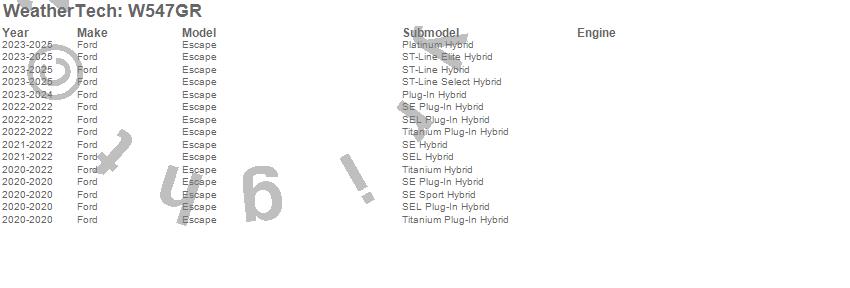 Below is an abbreviated list of applications for the All Weather Floor Mats.Escape, Ford, 2026, 2025, 2024, 2023, 2022, 2021, 2020