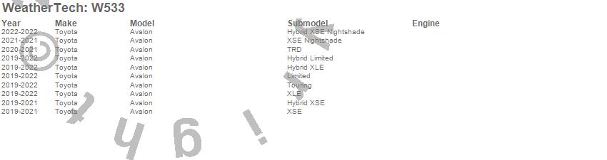 Below is an abbreviated list of applications for the All Weather Floor Mats.Avalon, Toyota, 2022, 2021, 2020, 2019