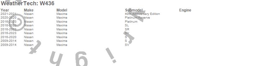 Below is an abbreviated list of applications for the All Weather Floor Mats.Maxima, Nissan, 2023, 2022, 2021, 2020, 2019, 2018, 2017, 2016, 2014, 2013, 2012, 2011, 2010, 2009