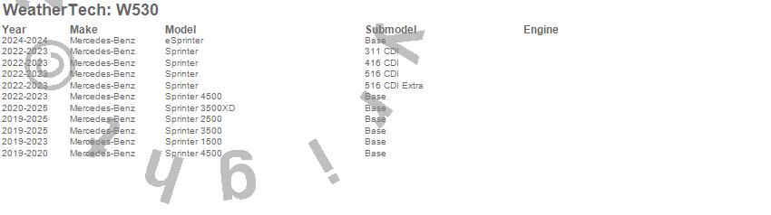 Below is an abbreviated list of applications for the All Weather Floor Mats.eSprinter, Sprinter, Sprinter 1500, Sprinter 2500, Sprinter 3500, Sprinter 3500XD, Sprinter 4500, Mercedes-Benz, 2025, 2024, 2023, 2022, 2021, 2020, 2019