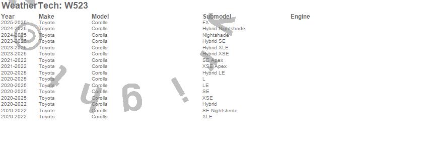 Below is an abbreviated list of applications for the All Weather Floor Mats.Corolla, Toyota, 2025, 2024, 2023, 2022, 2021, 2020