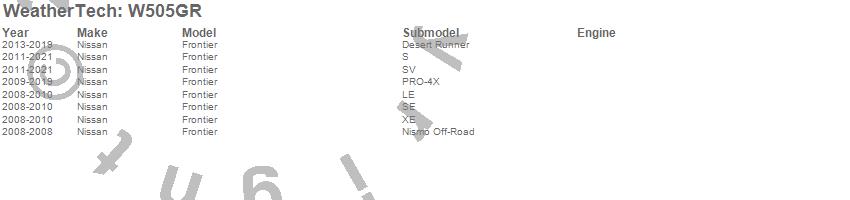 Below is an abbreviated list of applications for the All Weather Floor Mats.Frontier, Nissan, 2021, 2020, 2019, 2018, 2017, 2016, 2015, 2014, 2013, 2012, 2011, 2010, 2009, 2008