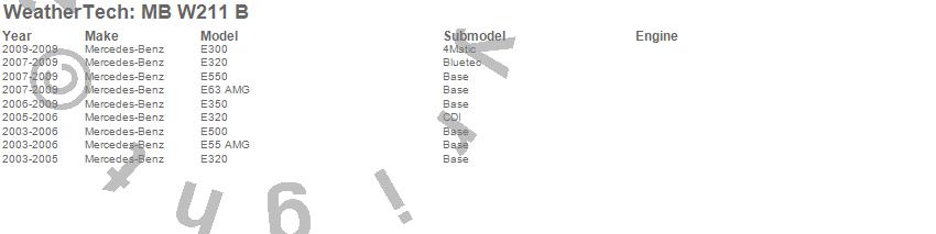 Below is an abbreviated list of applications for the All Weather Floor Mats.E300, E320, E350, E500, E55 AMG, E550, E63 AMG, Mercedes-Benz, 2009, 2008, 2007, 2006, 2005, 2004, 2003