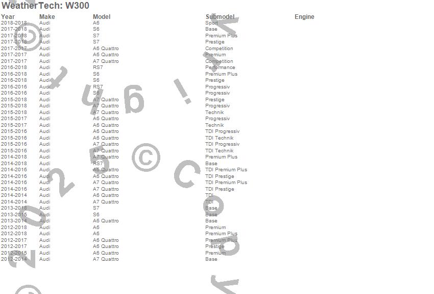 Below is an abbreviated list of applications for the All Weather Floor Mats.A6, A6 Quattro, A7 Quattro, RS7, S6, S7, Audi, 2018, 2017, 2016, 2015, 2014, 2013, 2012