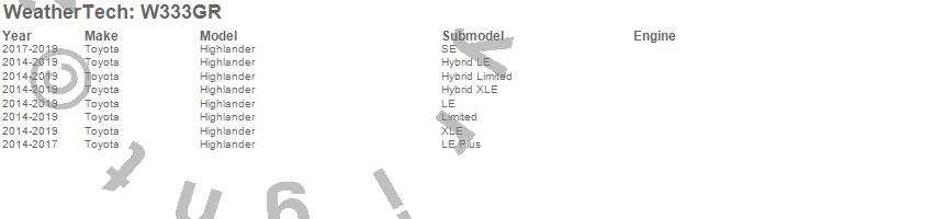 Below is an abbreviated list of applications for the All Weather Floor Mats.Highlander, Toyota, 2019, 2018, 2017, 2016, 2015, 2014