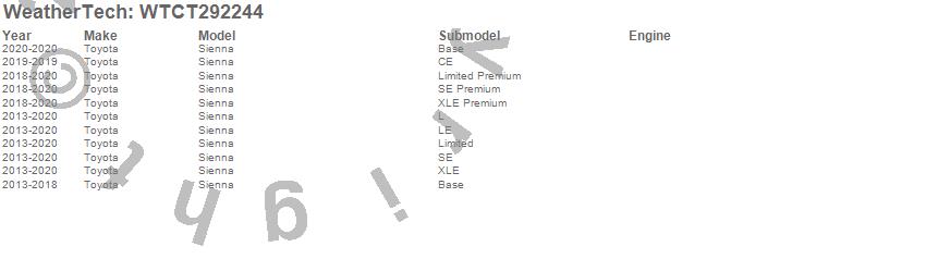 Below is an abbreviated list of applications for the All Weather Floor Mats.Sienna, Toyota, 2020, 2019, 2018, 2017, 2016, 2015, 2014, 2013