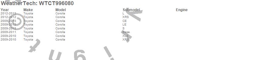 Below is an abbreviated list of applications for the All Weather Floor Mats.Corolla, Toyota, 2013, 2012, 2011, 2010, 2009