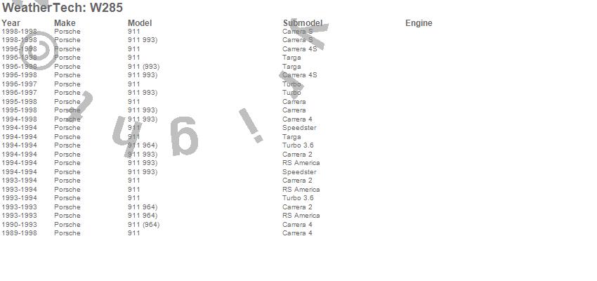Below is an abbreviated list of applications for the All Weather Floor Mats.911, Porsche, 1998, 1997, 1996, 1995, 1994, 1993, 1992, 1991, 1990, 1989