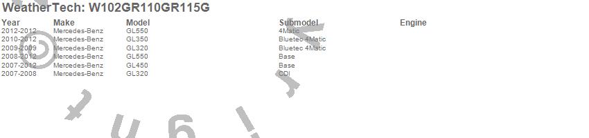 Below is an abbreviated list of applications for the All Weather Floor Mats.GL320, GL350, GL450, GL550, Mercedes-Benz, 2012, 2011, 2010, 2009, 2008, 2007