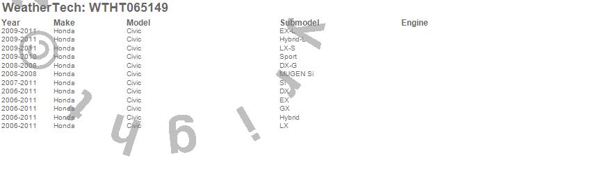 Below is an abbreviated list of applications for the All Weather Floor Mats.Civic, Honda, 2011, 2010, 2009, 2008, 2007, 2006