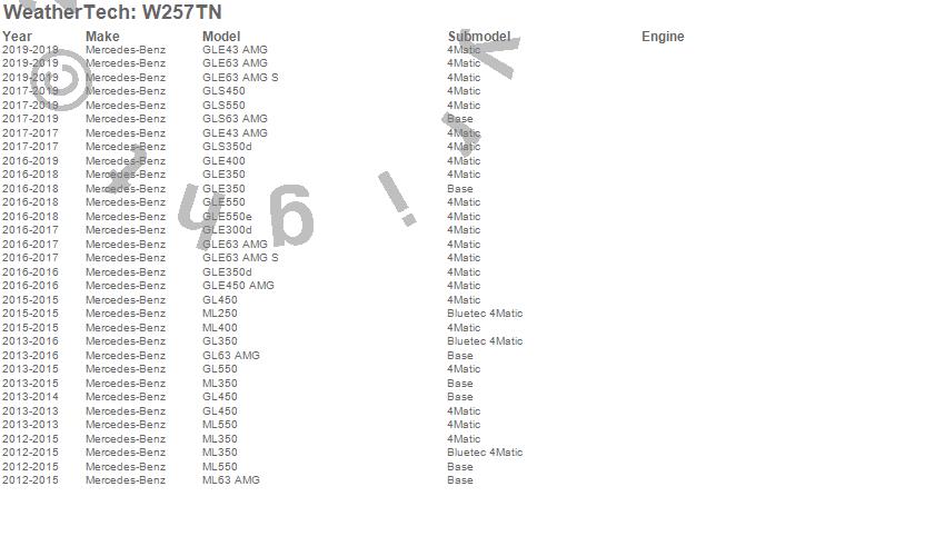 Below is an abbreviated list of applications for the All Weather Floor Mats.GL350, GL450, GL550, GL63 AMG, GLE300d, GLE350, GLE350d, GLE400, GLE43 AMG, GLE450 AMG, GLE550, GLE550e, GLE63 AMG, GLE63 AMG S, GLS350d, GLS450, GLS550, GLS63 AMG, ML250, ML350