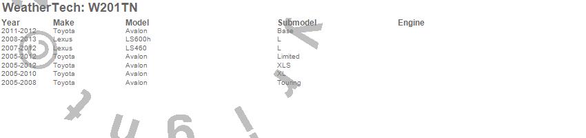 Below is an abbreviated list of applications for the All Weather Floor Mats.Avalon, LS460, LS600h, Lexus, Toyota, 2013, 2012, 2011, 2010, 2009, 2008, 2007, 2006, 2005