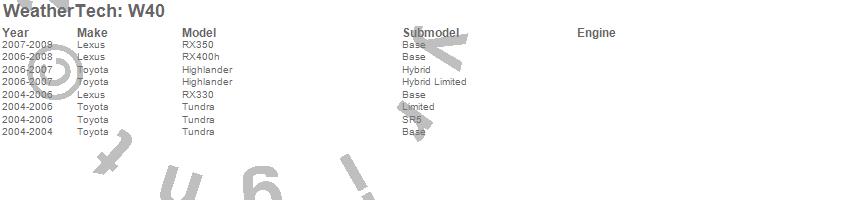 Below is an abbreviated list of applications for the All Weather Floor Mats.Highlander, RX330, RX350, RX400h, Tundra, Lexus, Toyota, 2009, 2008, 2007, 2006, 2005, 2004