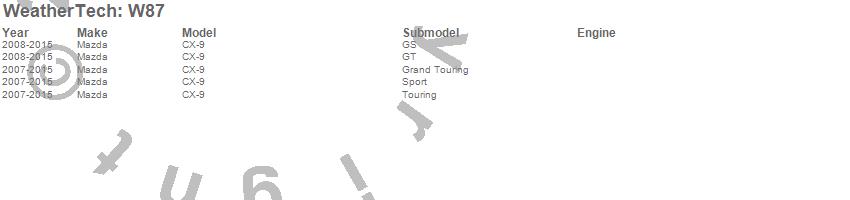 Below is an abbreviated list of applications for the All Weather Floor Mats.CX-9, Mazda, 2015, 2014, 2013, 2012, 2011, 2010, 2009, 2008, 2007