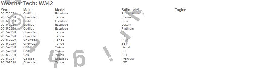 Below is an abbreviated list of applications for the All Weather Floor Mats.Escalade, Tahoe, Yukon, Cadillac, Chevrolet, GMC, 2020, 2019, 2018, 2017, 2016, 2015
