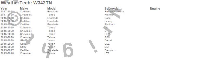 Below is an abbreviated list of applications for the All Weather Floor Mats.Escalade, Tahoe, Yukon, Cadillac, Chevrolet, GMC, 2020, 2019, 2018, 2017, 2016, 2015