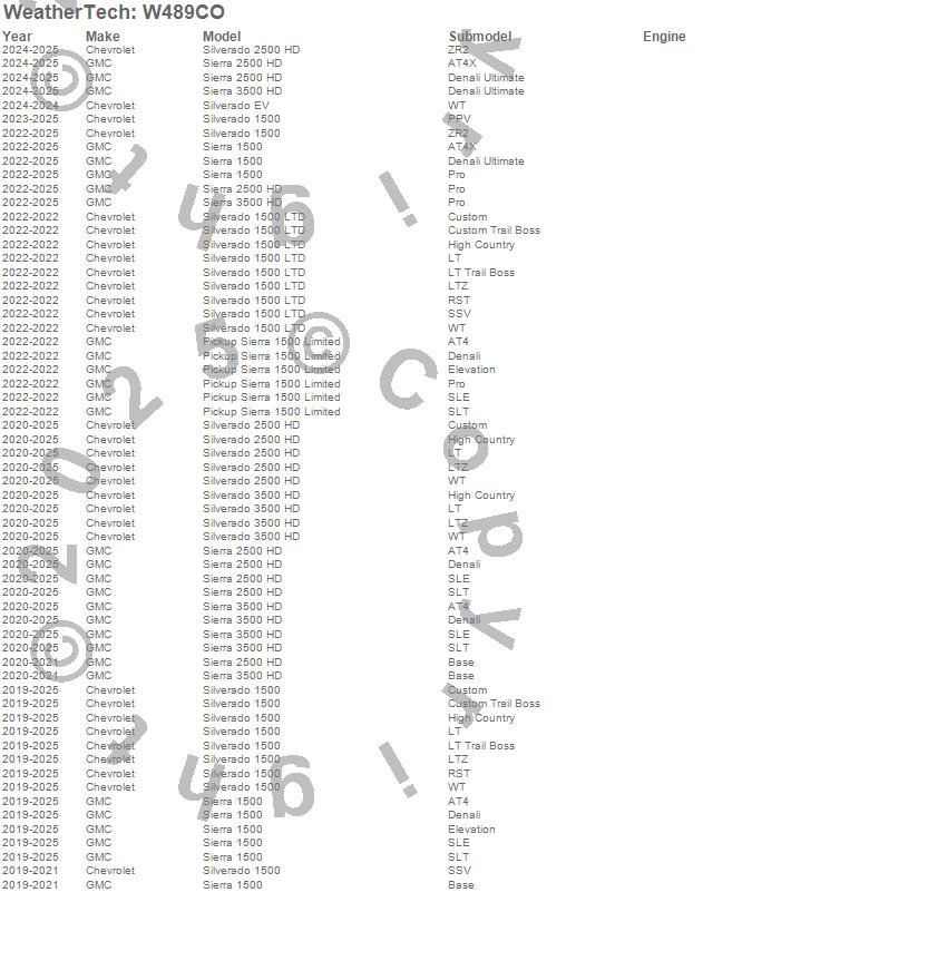 Below is an abbreviated list of applications for the All Weather Floor Mats.Pickup Sierra 1500 Limited, Sierra 1500, Sierra 2500 HD, Sierra 3500 HD, Silverado 1500, Silverado 1500 LTD, Silverado 2500 HD, Silverado 3500 HD, Silverado EV, Chevrolet, GMC, 2026, 2025, 2024, 2023, 2022, 2021, 2020, 2019