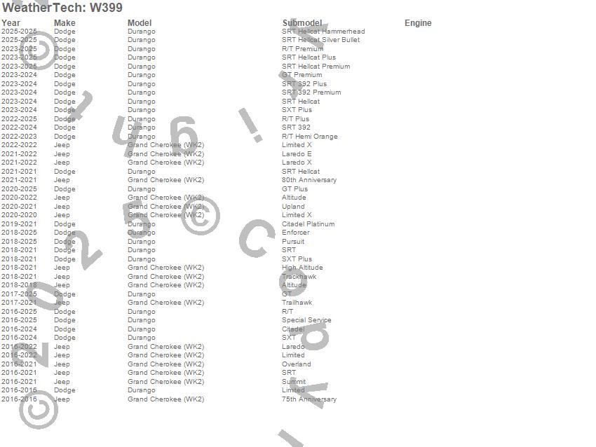 Below is an abbreviated list of applications for the All Weather Floor Mats.Durango, Grand Cherokee (WK2), Dodge, Jeep, 2026, 2025, 2024, 2023, 2022, 2021, 2020, 2019, 2018, 2017, 2016