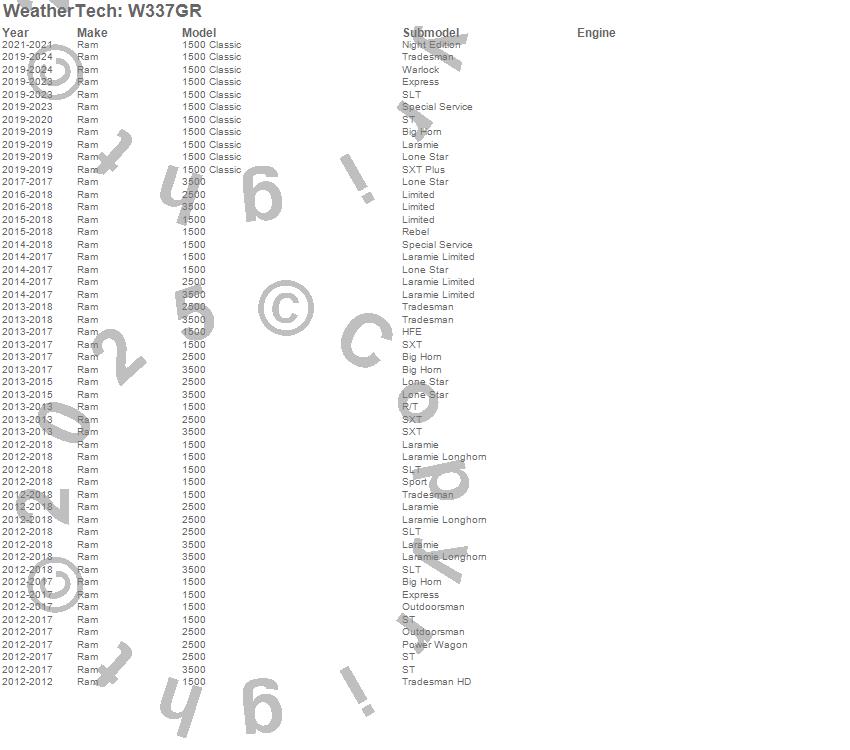 Below is an abbreviated list of applications for the All Weather Floor Mats.1500, 1500 Classic, 2500, 3500, Ram, 2024, 2023, 2022, 2021, 2020, 2019, 2018, 2017, 2016, 2015, 2014, 2013, 2012