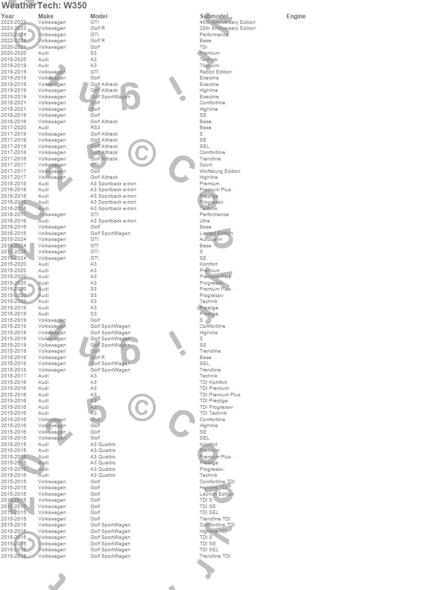 Below is an abbreviated list of applications for the All Weather Floor Mats.A3, A3 Quattro, A3 Sportback e-tron, Golf, Golf Alltrack, Golf R, Golf SportWagen, GTI, RS3, S3, Audi, Volkswagen, 2024, 2023, 2022, 2021, 2020, 2019, 2018, 2017