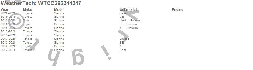 Below is an abbreviated list of applications for the All Weather Floor Mats.Sienna, Toyota, 2020, 2019, 2018, 2017, 2016, 2015, 2014, 2013
