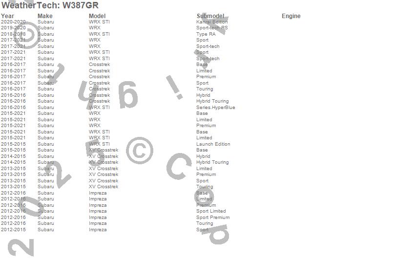 Below is an abbreviated list of applications for the All Weather Floor Mats.Crosstrek, Impreza, WRX, WRX STI, XV Crosstrek, Subaru, 2021, 2020, 2019, 2018, 2017, 2016, 2015, 2014, 2013, 2012