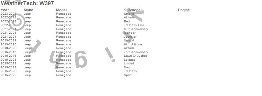 Below is an abbreviated list of applications for the All Weather Floor Mats.Renegade, Jeep, 2023, 2022, 2021, 2020, 2019, 2018, 2017, 2016, 2015