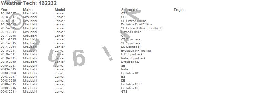 Below is an abbreviated list of applications for the FloorLiner DigitalFit.Lancer, Mitsubishi, 2017, 2016, 2015, 2014, 2013, 2012, 2011, 2010, 2009, 2008